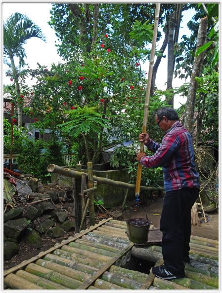 Puits avec système d'eau courante stockée dans un gros bambou.