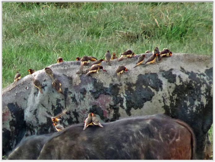 Hippopotame et Buffles couverts de Pique-boeufs à bec jaune