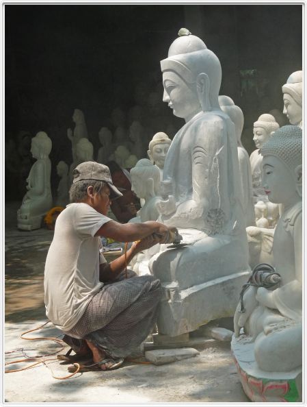 La rue des fabricants de bouddhas. La Birmanie est un grand exportateur de statues de Bouddha.